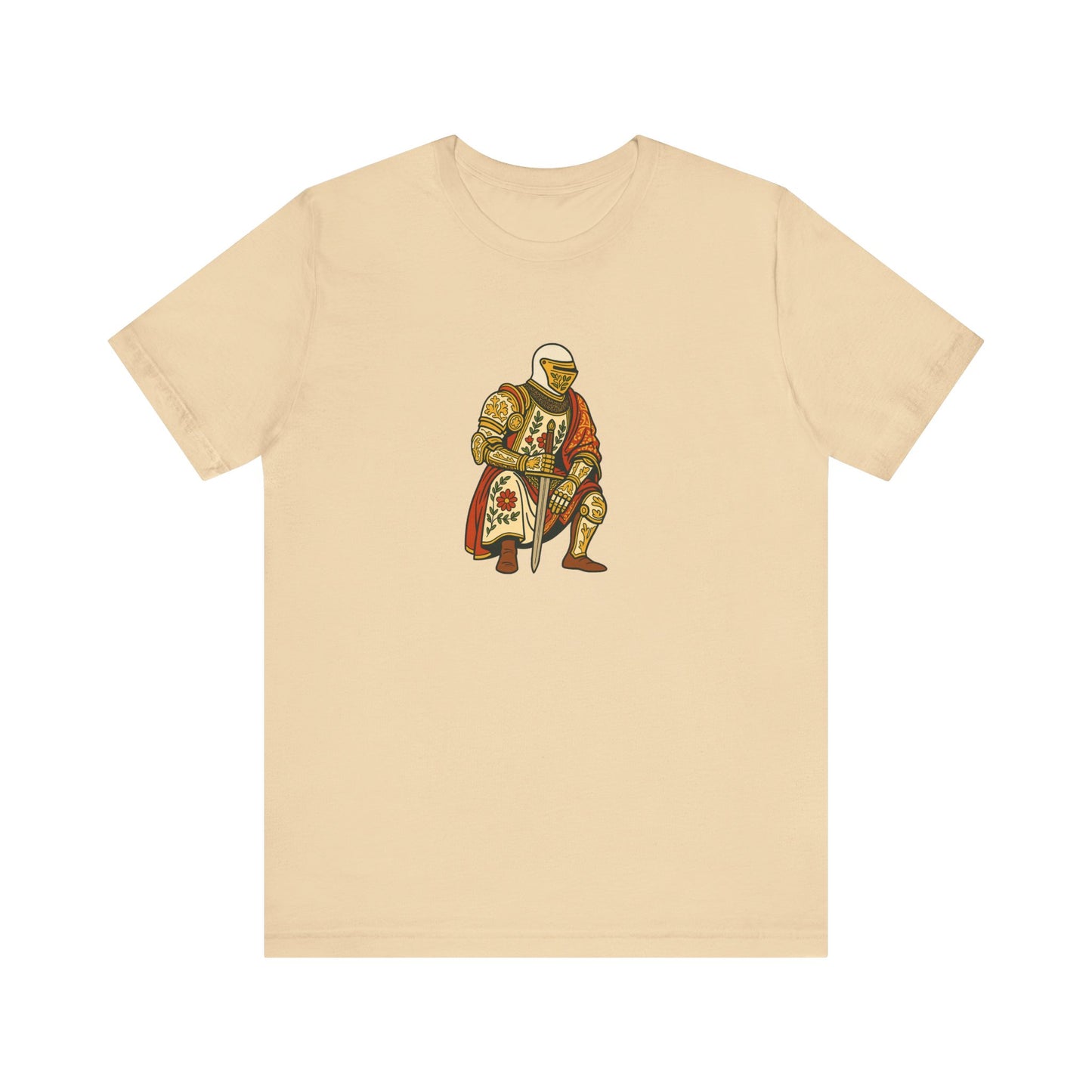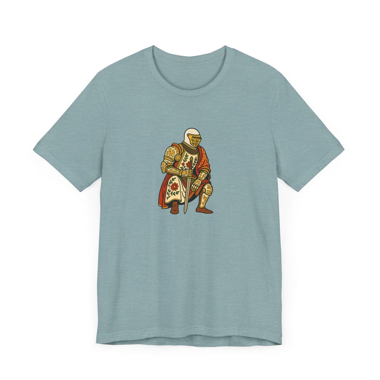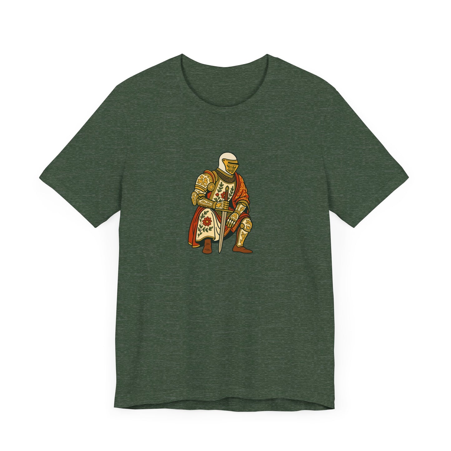 A Medieval Knight with original flora pattern Tee, perfect for those who appreciate historical and fantasy-themed designs. This Tee adds a touch of mystery and intrigue to everyday outfits. Ideal for medieval enthusiasts, fantasy lovers, and history buffs. Great for Renaissance fairs, cosplay events, and themed parties. (ML-09)