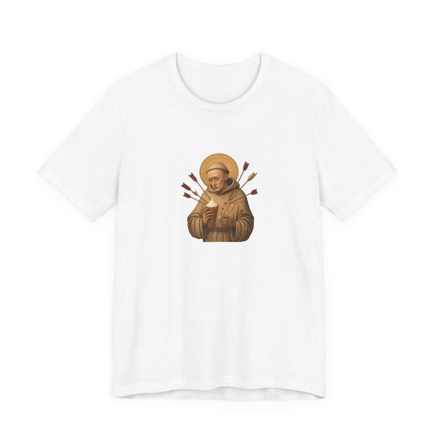 Channel medieval drama with a sweet twist in our Saint of Sorrows & Soft Serve T-shirt. This design features a solemn monk in classic Renaissance art style, pierced by arrows yet quietly contemplating an ice cream cone—a playful clash of ancient suffering and modern indulgence. With vintage tones and painterly textures, it’s perfect for lovers of irony, history, and subtle humor. Wear it to spark conversations or simply to remind the world that even in hard times… there's ice cream. (ML-09)
